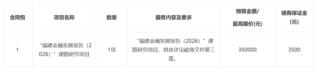 “福建金融发展报告(2026)”课题研究项目的潜在供应商应在福建省福州市鼓楼区五四路159号世界金龙大厦第14层A单元福建省智信招标有限公司财务部获取采购文件,并于[2025年12月15日] [下午2:30](北京时间)前提交响应文件。