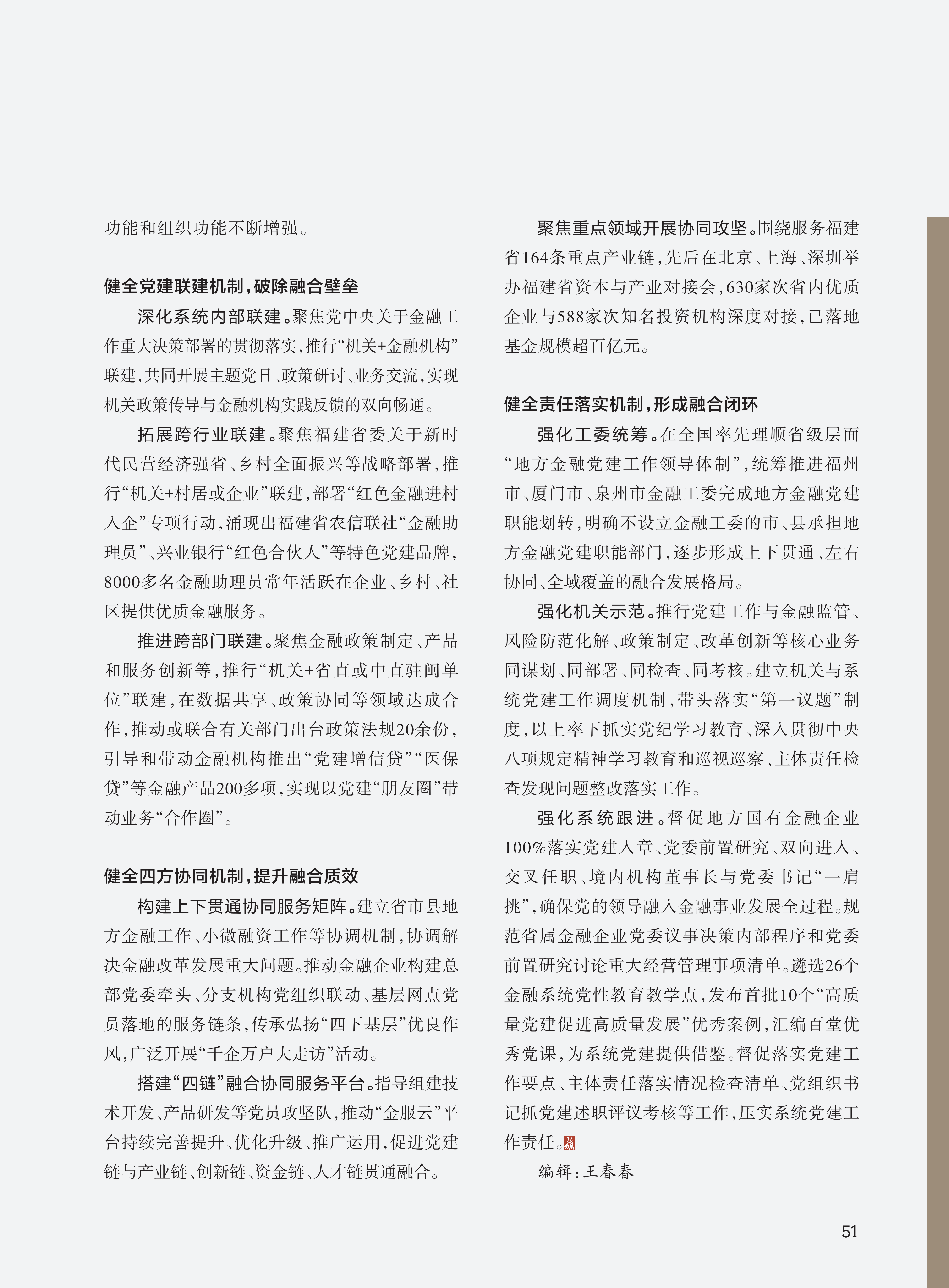 拓展跨行业联建。聚焦福建省委关于新时代民营经济强省、乡村全面振兴等战略部署,推行“机关+村居或企业”联建,部署“红色金融进村入企”专项行动,涌现出福建省农信联社“金融助理员”、兴业银行“红色合伙人”等特色党建品牌,8000多名金融助理员常年活跃在企业、乡村、社区提供优质金融服务。