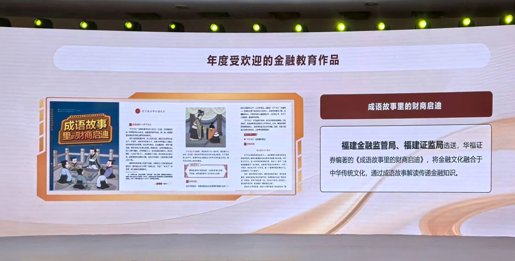 在启动仪式上,由福建金融监管局与福建证监局推荐、华福证券精心编著的《成语故事里的财商启迪》一书,荣获“年度受欢迎的金融教育作品”称号,并成为该奖项中唯一获选的证券机构作品。