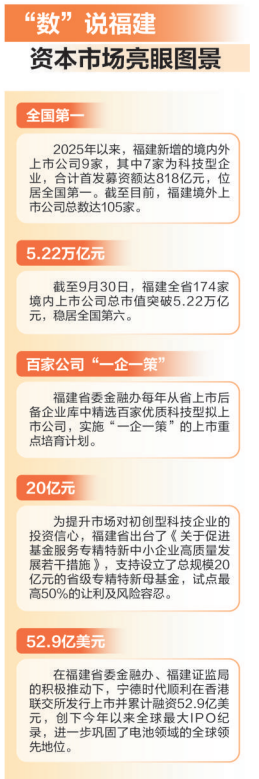 在福建省委金融办、福建证监局的积极推动下,宁德时代顺利在香港联交所发行上市并累计融资52.9亿美元,创下今年以来全球最大IPO纪录,进一步巩固了电池领域的全球领先地位。今年以来,福建新增的境内外上市公司9家,其中7家为科技型企业,合计首发募资额达818亿元,位居全国第一。截至目前,福建境外上市公司总数达105家。