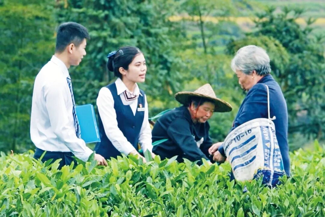 银行工作人员(左一、左二)与茶农亲切交谈。机构/供图