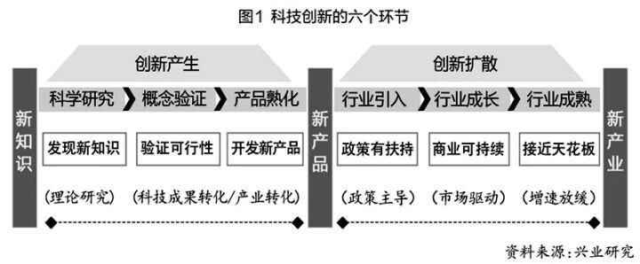 科技创新按照任务和目标的不同,可以细分为六个环节,分别是科学研究、概念验证、产品熟化、行业引入、行业成长、行业成熟(见图1)。如果将统计口径上的研发活动(包括基础研究、应用研究和试验发展)与这六个环节对应,基础研究和应用研究对应第一个环节,而试验发展可以拆分对应后五个环节。