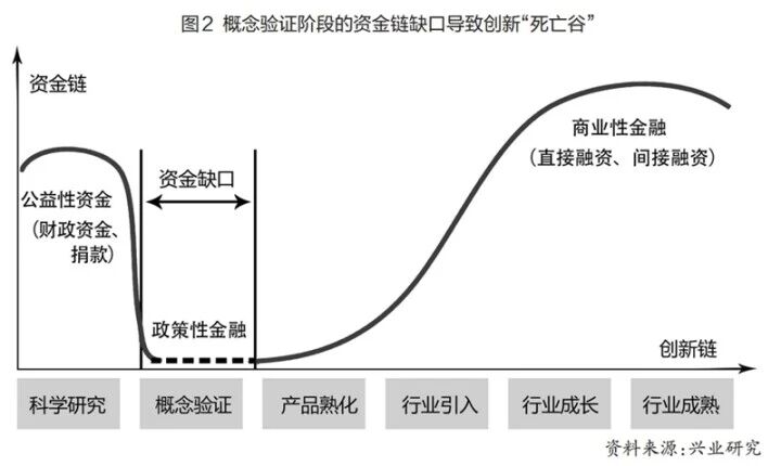 (二)概念验证阶段的资金链。概念验证阶段往往资金匹配缺乏,容易形成创新“死亡谷”。概念验证作为连接科学研究与产品熟化的关键环节,缺乏性质相匹配的资金供给。科研经费以学术成果(论文、专利)为考核导向,支持范围通常不包含成果转化阶段的探索成本,且资助周期与概念验证的长周期需求不匹配;商业性金融则以风险与收益平衡为原则,资金天然流向已通过验证、具备清晰商业模式的项目,对尚处于技术可行性与市场探索阶段的概念验证环节介入意愿有限。科研经费“管不着”、商业资本“不愿管”,导致概念验证成为创新征途中的“死亡谷”——大量具有产业化潜力的科研成果,无法完成新理论到新产品的关键一跃。(见图2)