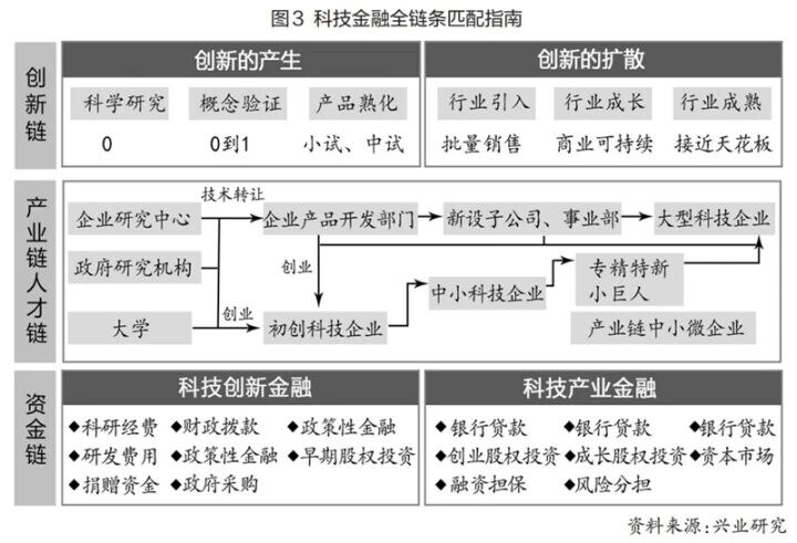 基于科技创新的全链条划分,科技金融体系可相应划分为科技创新金融与科技产业金融两部分,分别匹配创新产生与创新扩散阶段。创新产生阶段投入周期长、成果不确定性高和产出外部性强,需构建财政资金、政策性金融和商业性金融的三方接力;创新扩散阶段验证周期短、风险可估计、收益内部化,商业性金融可以更好地发挥主导作用。(见图3)