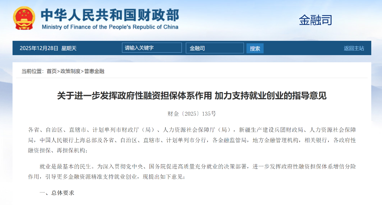 为进一步发挥政府性融资担保体系增信分险作用,引导更多金融资源精准支持就业创业,财政部日前会同人力资源社会保障部、中国人民银行、金融监管总局印发《关于进一步发挥政府性融资担保体系作用 加力支持就业创业的指导意见》(以下简称《指导意见》)。