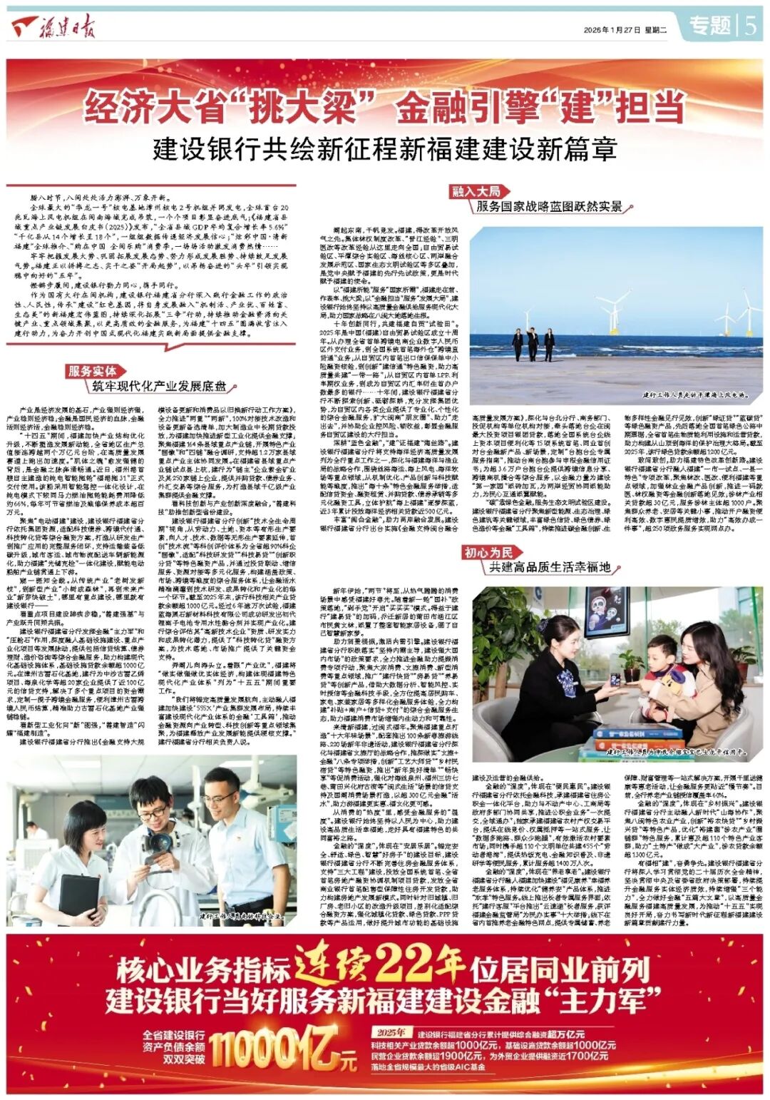 从助力“两重”项目,落实“两新”部署,基础设施贷款余额超1000亿元,消费贷款及龙卡信用卡去年带动消费交易超1800亿元,到主动服务“海丝”核心区、两岸融合发展示范区、国家生态文明试验区等重大战略,“十四五”期间为外贸外资企业提供融资超5700亿元,绿色贷款余额超1100亿元;福建建行牢记“国之大者”,持续推动经济发展与改善民生同向而行。