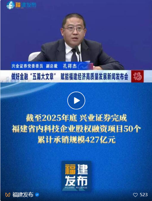 截至2025年底,兴业证券完成省内科技企业股权融资项目50个,累计承销规模427亿元,覆盖信息技术、集成电路、高端制造、新能源、新材料、生物医药等重点领域。