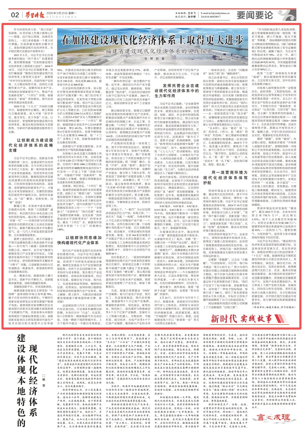 3月23日,学习时报第02版刊发了福建日报、学习时报联合推出文章《在加快建设现代化经济体系上取得更大进步——福建省建设现代化经济体系的实践探索》。文章聚焦福建让创新成为建设现代化经济体系的战略支撑、以链群协同思维加快构建现代化产业体系、发挥民营企业在建设现代化经济体系中的生力军作用、用一流营商环境为现代化经济体系保驾护航。一起来看详情——