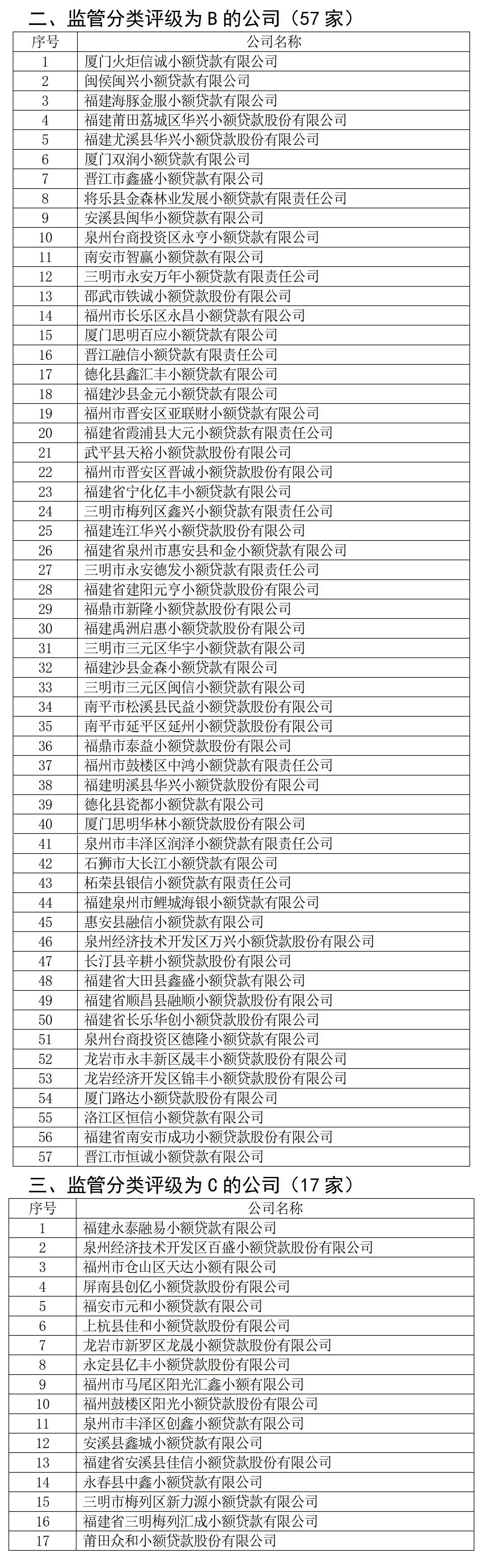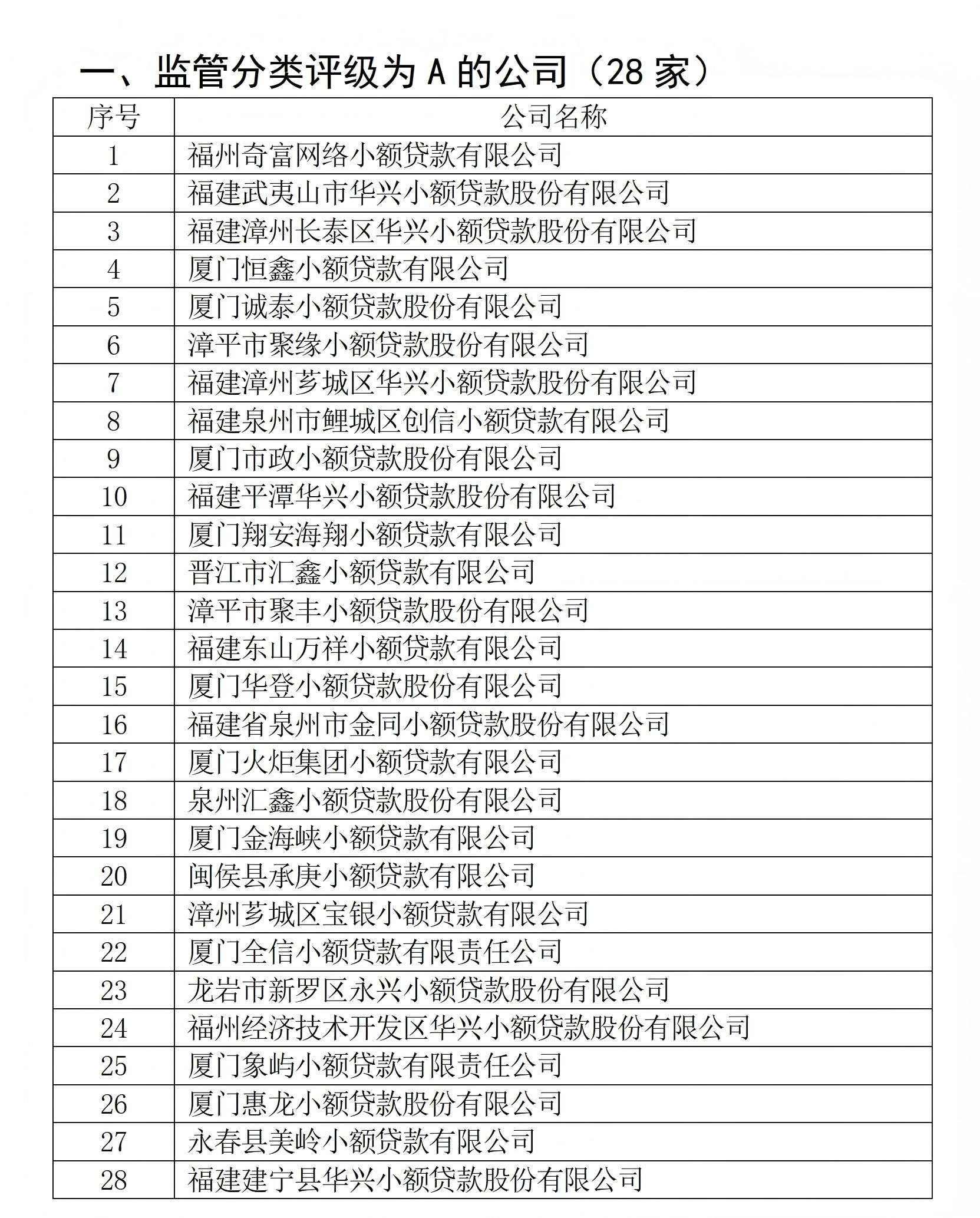 根据《福建省小额贷款公司暂行管理办法(2023年修订)》(闽政办〔2023〕25号)、《福建省小额贷款公司监管分类评级办法》(闽金融〔2024〕13号)和《福建省地方金融管理局关于开展2024年度福建省小额贷款公司监管分类评级工作的通知》(闽金融函〔2025〕20号),我局组织开展了2024年度福建省小额贷款公司监管分类评级工作。经公司自评、县区初评、设区市复评、我局审定及公示等环节,现将2024年度福建省小额贷款公司监管分类评级结果公布如下: