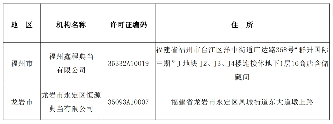 上述2家企业持有的原《典当经营许可证》(正、副本)自公告之日起自动失效,企业不得开展新的典当业务,并应于60日内到市场监管部门变更名称及经营范围。具体信息如下: