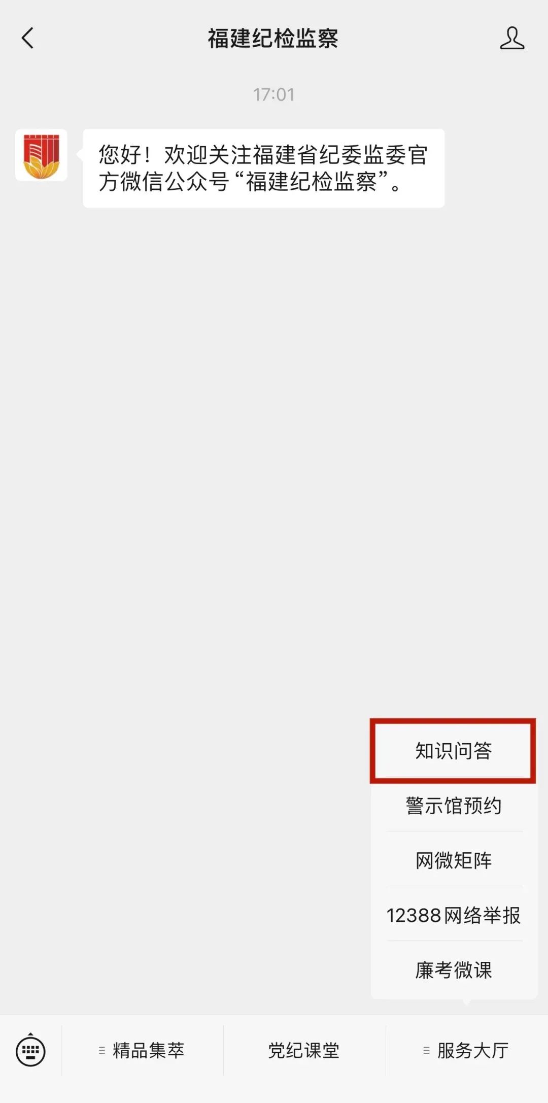 长按识别下方二维码关注“福建纪检监察”微信公众号,点击菜单栏“服务大厅”→“知识问答”。