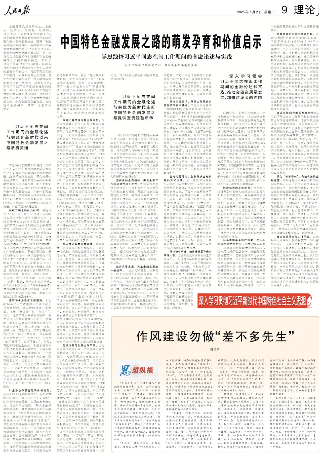 习近平同志在闽工作期间的金融论述与实践,来自他在改革开放最前沿的不懈探索以及对如何发展经济、改善民生的不断思考,植根于八闽大地,与人民群众同呼吸共命运,彰显了习近平同志坚持把马克思主义金融理论同当代中国具体实际相结合、同中华优秀传统文化相结合的自觉意识,与实现中华民族伟大复兴对现代金融事业的根本要求相融相通,为新时代走好中国特色金融发展之路提供了历久弥新的宝贵经验启示。
